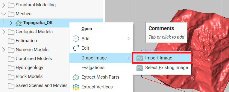 En el Árbol de proyectos, expanda la carpeta "Meshes", luego haga clic con el botón derecho del ratón en la mesh donde desea proyectar la imagen georreferenciada, haga clic en Imagen de drapeado > Importar imagen/ Seleccionar imagen existente.