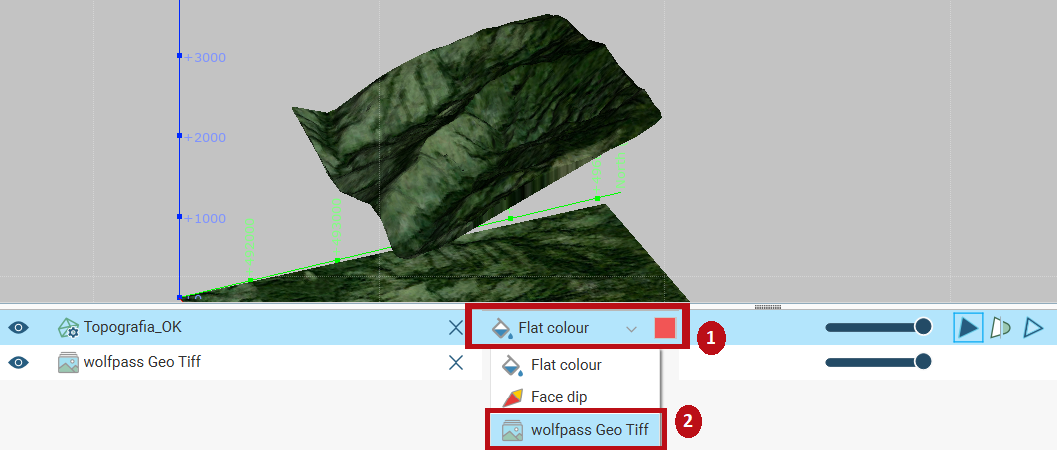 Arrastra Mesh a la escena y a la lista de formas, ve a select display y haz click en la opción Flat colour y selecciona tu imagen georeferenciada.