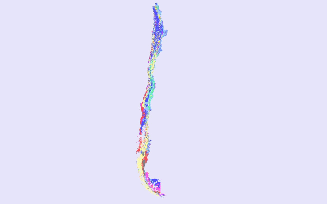 La vista nos permite identificar el plano de subducción (Benioff) y la geología de Chile (Sernageomin, 1:1.000.000).