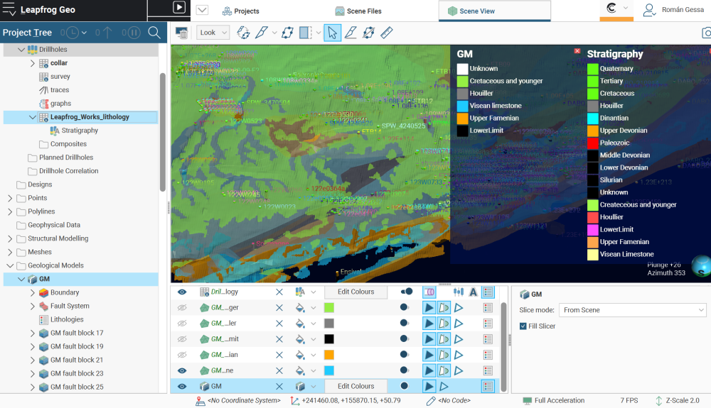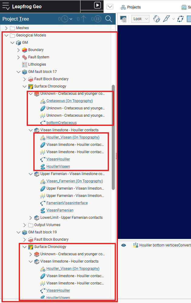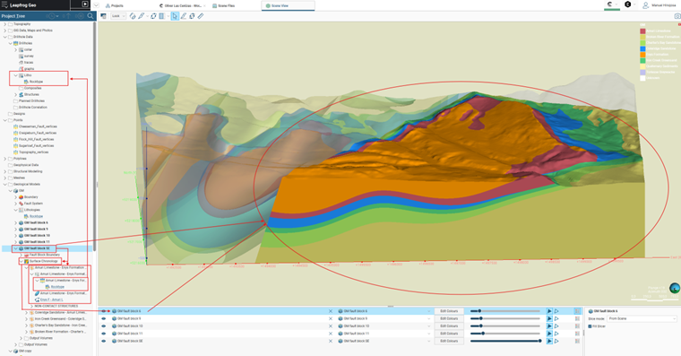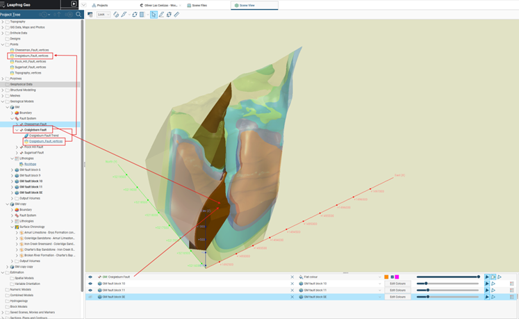 I have been given a large scale geological model in Leapfrog that I have to reinterpret/modify. This model has been built with loads of data (>1000 BHs, cross sections, maps) and blocks separated by faults. To modify the model I need to know first what information the model and the blocks are using. How can I find that?