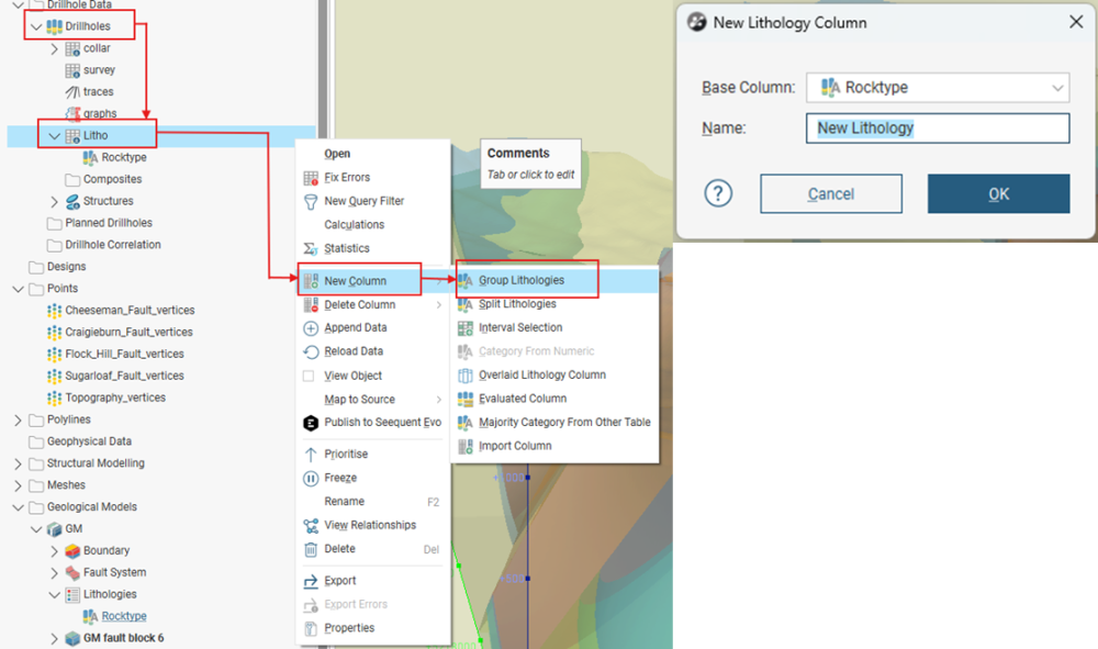 1) Regarding the units, they are usually grouped together to make the geological model more readable and interpretable, depending on the modeling team's objective. This can be done using the “New Column” -> “Group Lithologies” tool. In “Base Column,” select your boreholes and assign them a name.