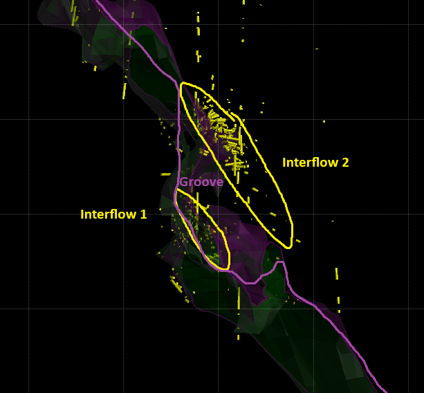 I would like to create a model for the coarse sediment within a larger sediment package using refine model option. It is mostly settled in a groove but can also be a lens shaped interflow as you can see below in bright yellow: