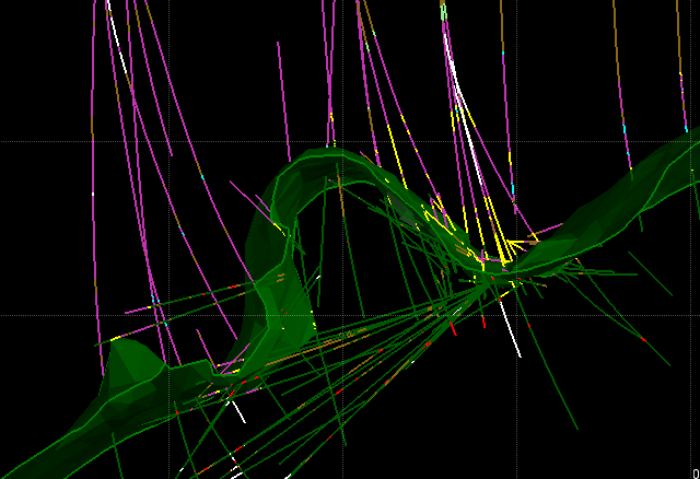 I've tried to use upper deposit contact and lower deposit contact of yellow against both green and purple units, resulting a patchy volume, not true to the drilling data.