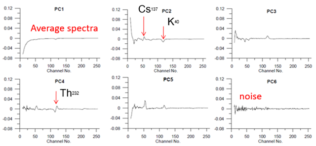 This graphic shows the first six principal components of a typical (256-channel in this case) gamma-ray spectrum (adapted from Mauring & Smethurst, 2005). The first component (PC1) represents the average spectra. Components 2-5 show a signal at channel 55 from Caesium-137 and the channels 109-125 show a signal from Potassium-40. In this case, the components are shifted slightly due to instrument drift. Component 4 shows a signal from Thorium-232 between channels 189-220. Component 6 is dominated by noise, so in this case five components are likely enough to reconstruct the signal, using NASVD.