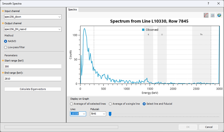 A significant part of the RPS is a modern implementation of spectral smoothing, using Noise Adjusted Singular Value Decomposition (NASVD), which is a widely accepted type of Principal Component Analysis that is employed to smooth gamma-ray spectra prior to generating and processing radioelement counts. Here is a brief introduction to the technique, why it is used and how it is implemented in Oasis montaj.