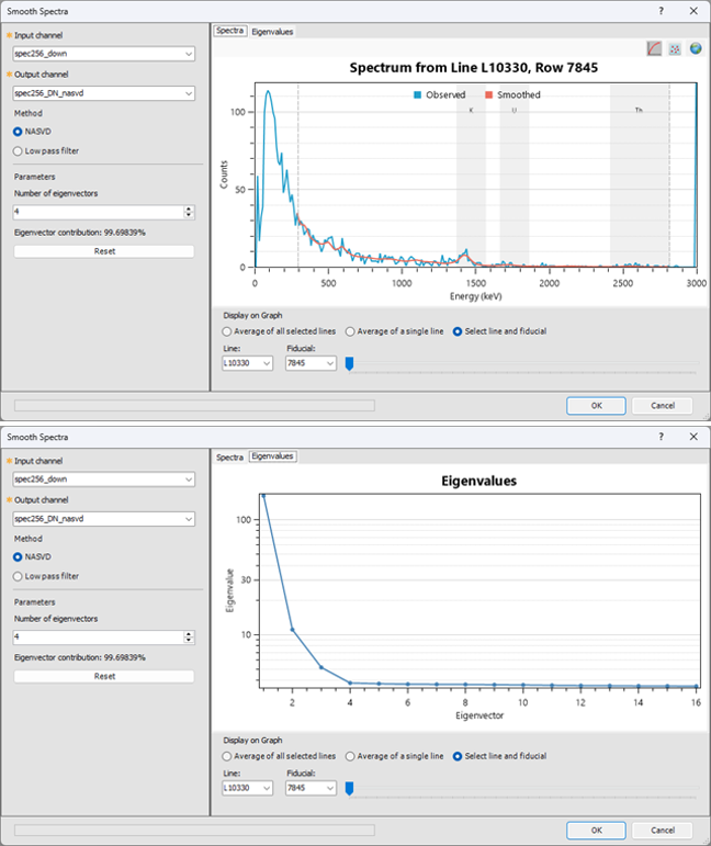 A key to using NASVD is identifying how many principal components, or eigenvector, to use when reconstructing the spectrum. There is not a lot of consensus among experts or established "best practice" with respect to this, other than agreement that careful analysis of the eigenvectors and their associated eigenvalues is required. We designed the Smooth Spectra dialog to make this analysis as straightforward as possible. A typical application of NASVD in Oasis montaj involves the following steps: