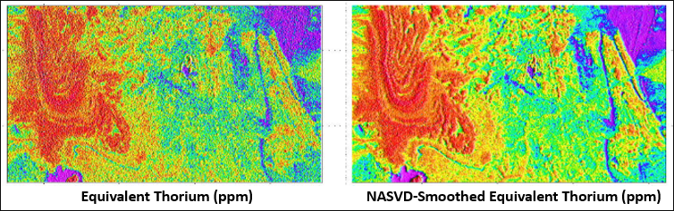 As with almost all geophysical methods, improving the signal-to-noise ratio makes the final data much easier to interpret geology or otherwise from; the example below compares a thorium count with one that has been smoothed using NASVD: