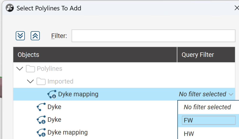 My issue is that there doesn’t seem to be a way to use a query filter when adding a polyline for a hangingwall or footwall in a vein . Am i missing a step or is there a work-around? (see crude marked-up screenshot below).