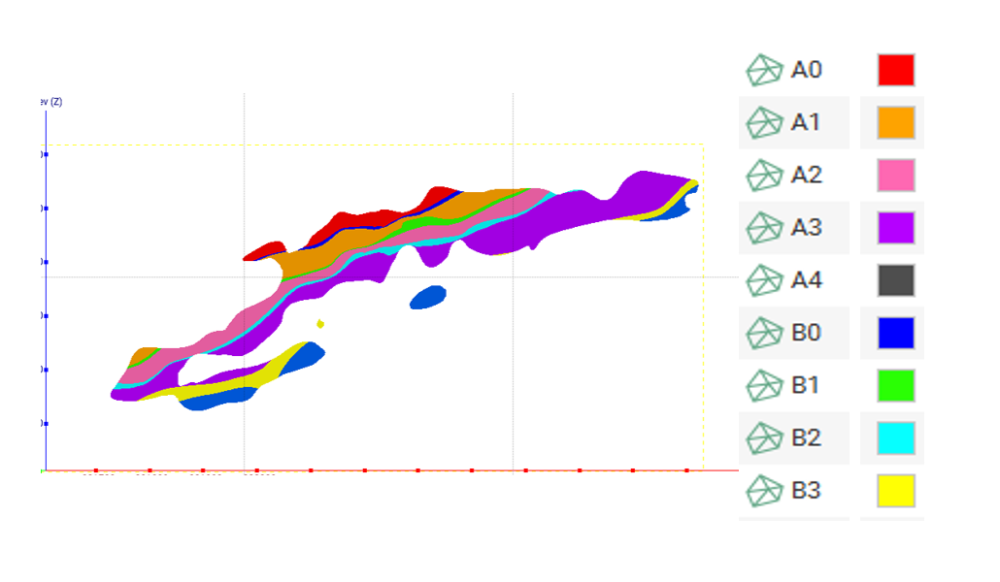 - My goal: HOST ROCK should be divided into 5 separate lithologies (A0 to A4) by the 4 B bodies, and the model should update dynamically when the B meshes are revised by the geology team